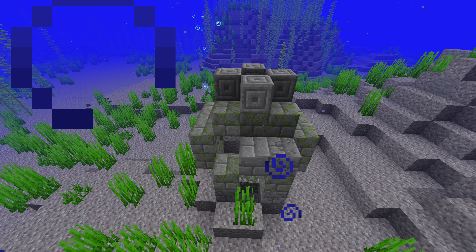 | underwater_ruin/ brick_2 | A small structure with not much height. Consists of randomly placed stone bricks and mossy cobblestone. These 3 generate combined with each other. |