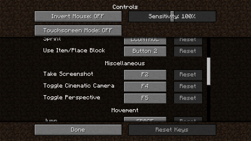 | Discrete Scrolling | Tells the game to ignore scroll magnitude values given by the operating system and instead to act as if the operating system supplied −1 or +1. | OFF |