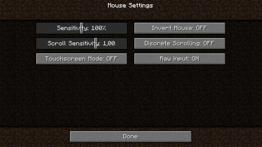 | Scroll Sensitivity | Changes the sensitivity of the scroll wheel in-game. Values above 1 do not affect selecting items in the Hotbar. | 1.00 |