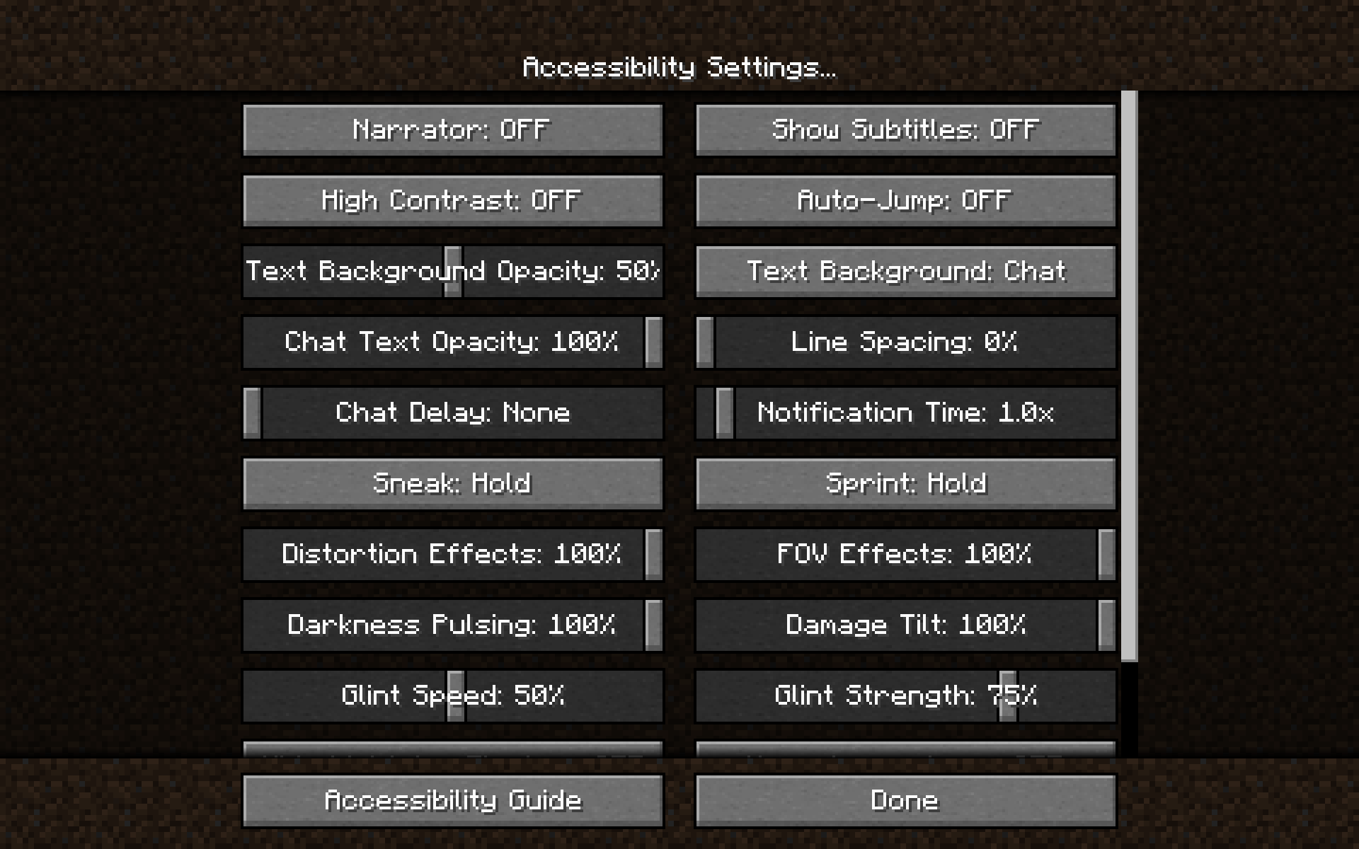 | Distortion Effects | Changes the distortion effects (e.g. Nausea and nether portal distortion). | 100% | |||||||||||||||||||||||||||||||||||||||||||||||||||||||||||||||||||||||||||||||||||||||||||||||||||||||||||||||||||||||||||||||||||