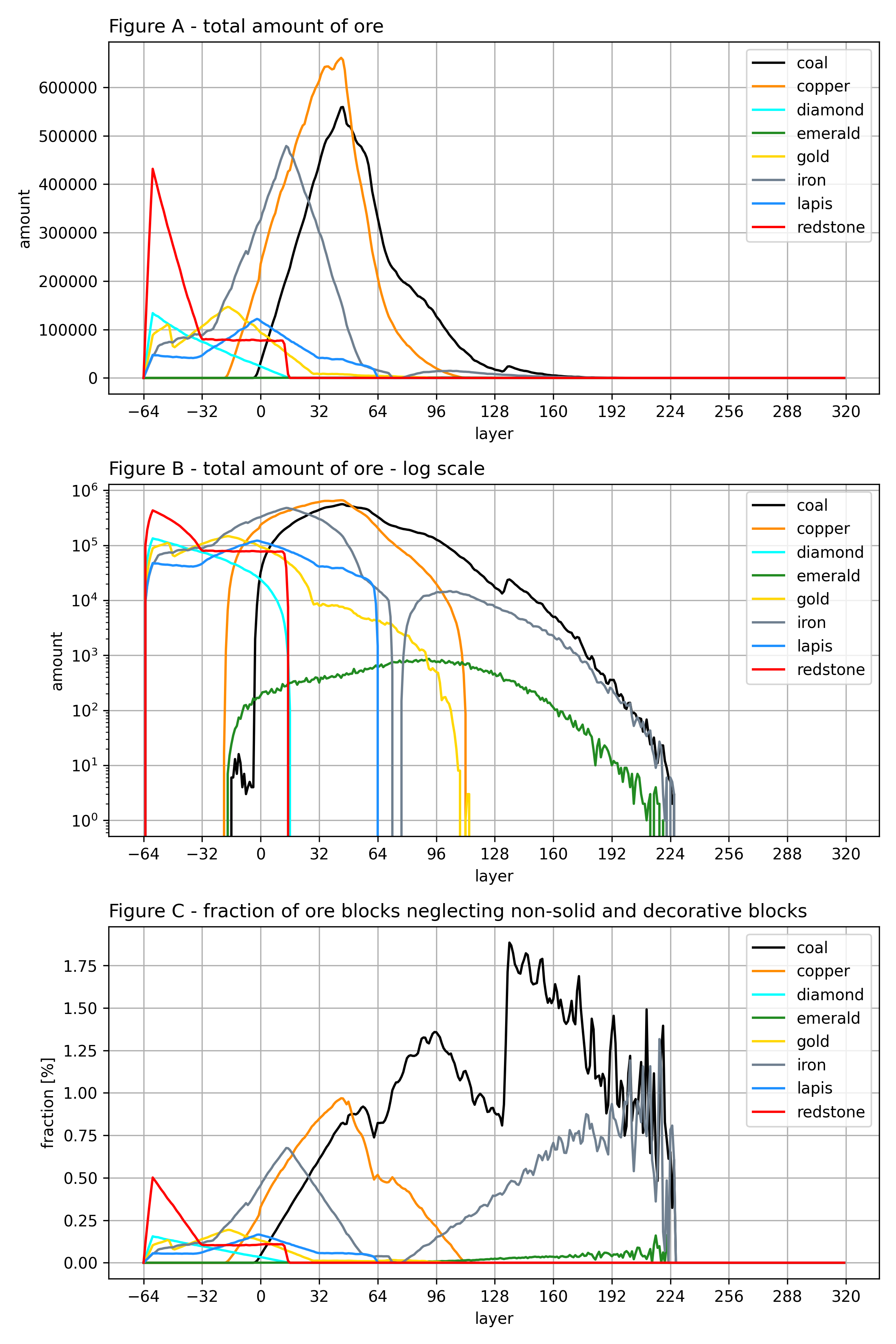 This graph shows the actual amount of ores found in a relatively small but untapped world as of Java Edition 1.12.2.