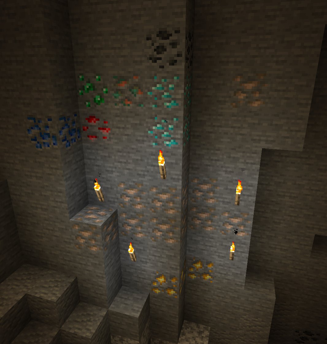 | Coal[a] | Copper | Lapis Lazuli | Iron | Gold | Redstone | Diamond | Emerald[b] | |||