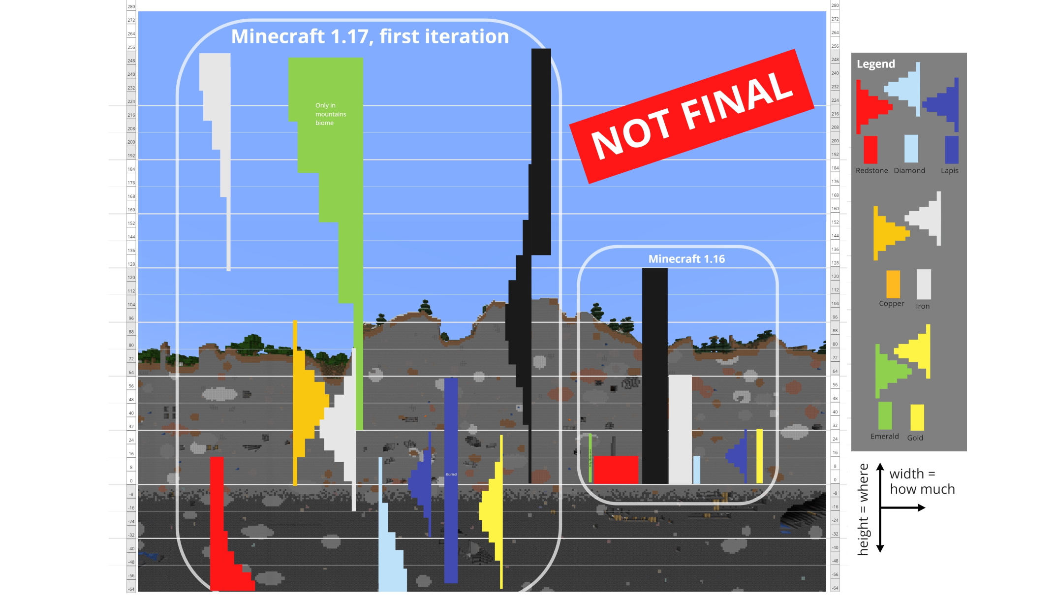 - ↑ Unlike most other ores, ancient debris' frequency peaks at layer 15, and quickly tapers off above and below.