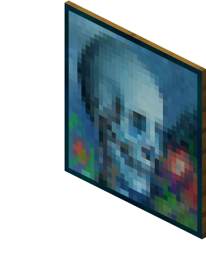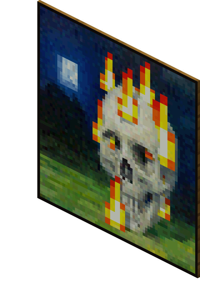 A Skull on fire; in the background there is a moon in a clear night sky. This painting is based on a Minecraft screenshot,[3] with the grass block and a 3D skull added on top.[4] (See the trivia section for more info.) |