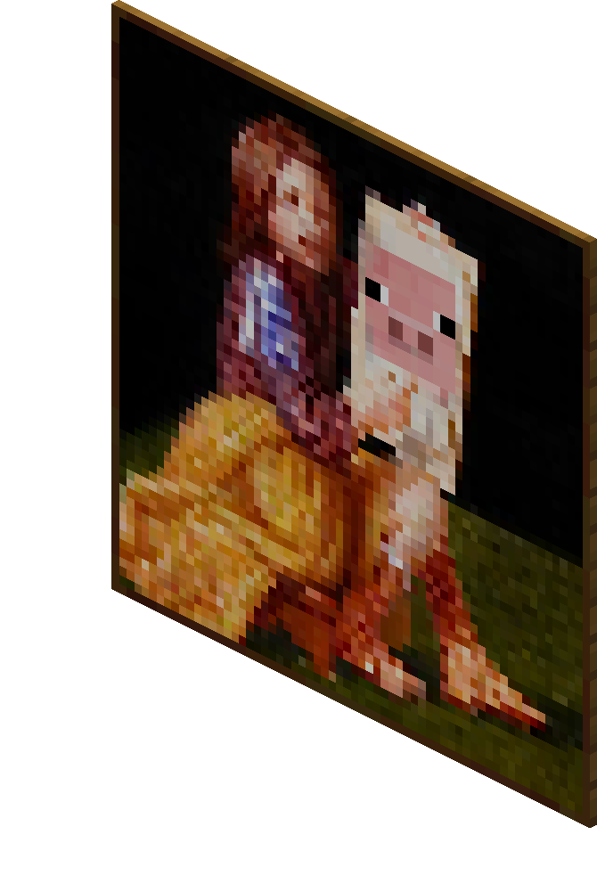 A girl pointing to a pig on a canvas. In the original version, the canvas showed red, green and blue blocks, representing the three colors of the RGB color model that is typically used by computer displays. It is based on the painting The Artist's Studio by Jacob van Oost. | Alpha v1.1.1 | |