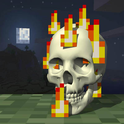 - The "Skull on Fire" painting contains a Minecraft world in the background, which is based on a screenshot taken by the artist in Alpha 1.1.2_01 (or earlier) on October 12, 2010, at 13:22:49 (UTC+2).[8]