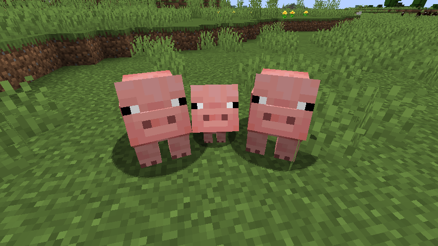Pigs are passive mobs that are the source of porkchops, and are a renewable source of food. They are 0.875 blocks tall, 0.625 blocks wide and 1.25 blocks long.