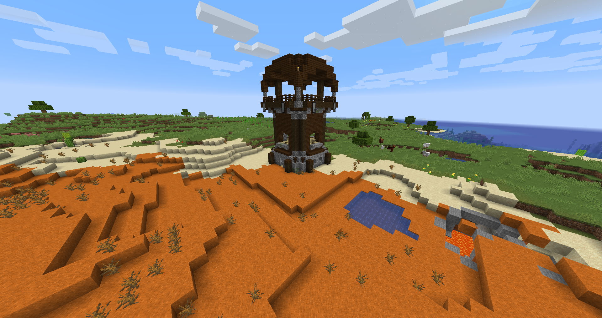In Java Edition, if an outpost spawns in the water or in the air (e.g., spawning near a savanna plateau), then a platform of grass (or sand), dirt, and stone spawns underneath it in a circular shape. This also applies to the smaller structures such as tents, targets, log piles, and cages. On occasion, the smaller structures still spawn in the air despite having a platform below them, depending on how high up they are.