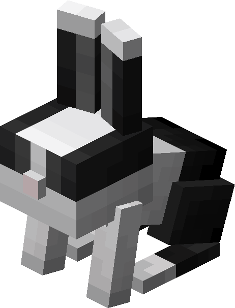 Naming a rabbit Toast (using either a name tag or a renamed spawn egg) re-textures it to have the appearance of a black dutch, with a large black and white patch and more black fur around the face than the natural black and white spotted rabbit. Other than its name and skin, Toast behaves exactly like it would if it were unnamed. When Toast rabbits are bred, whether with each other or with regular rabbits, their offspring do not have the Toast pattern; they have a pattern consistent with the parents' original coloring prior to renaming. If the player renames a killer bunny to Toast, it still attacks players and wolves. Like the killer bunny, Toast does not spawn naturally.