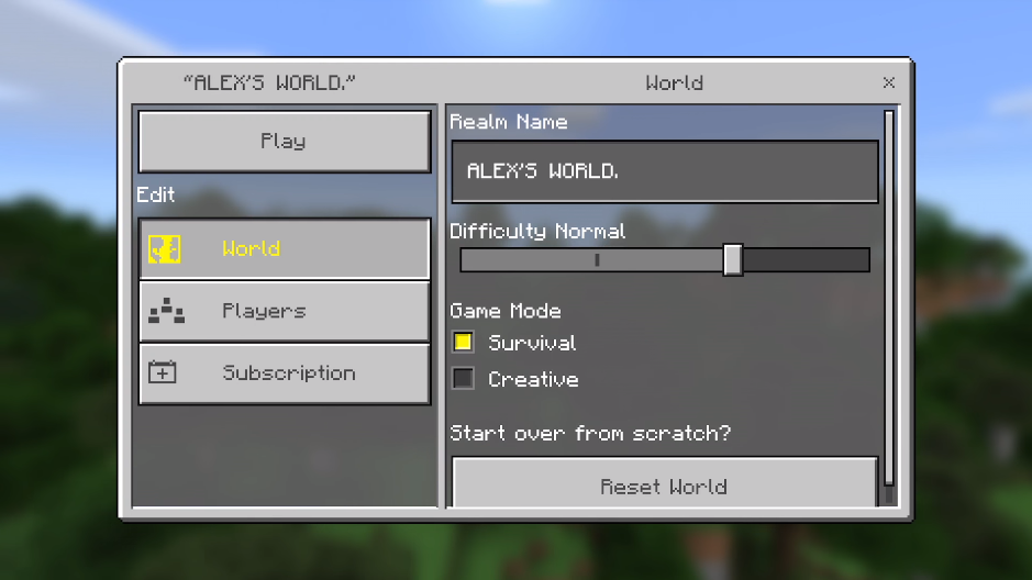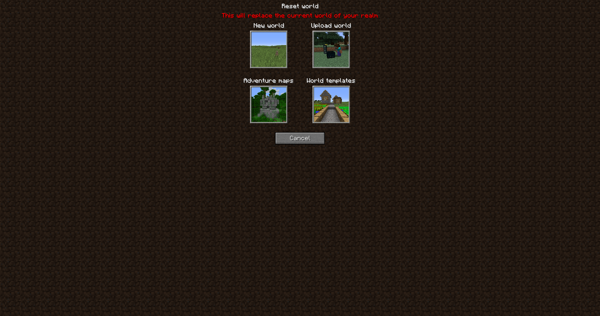 Users can choose to temporarily replace their world with a Minigame or permanently replace their world with maps from the following categories: World templates, Adventures, Experiences, or Inspiration. Most commands or options cannot be used while the realm is running a minigame. These maps are selected from community submissions by the Minecraft Content Team. Certain maps may not be available on Realms due to being phased out or incompatible with the current update. Users cannot delete a map, but they can reset it.