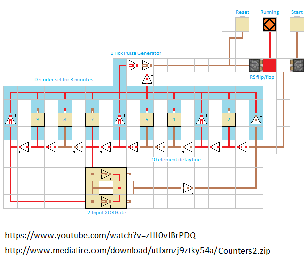 Note that the XOR gate takes it inputs (Taps) from redstone repeater 7 and 10. For simplicity sake, these have been listed 2 tap LFSR sequences. In Minecraft, one could make a 1-many delay line structure to create more complicated clocks.