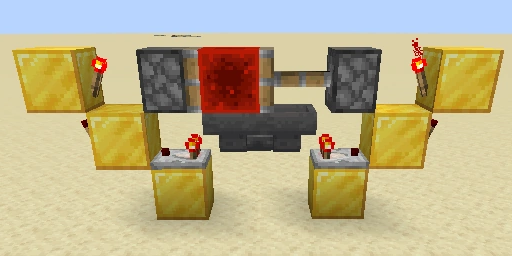 Device R creates energy in an irregular sequence. It is a variant of the "Rapid Pulsar" design shown above, except that each torch pulses in an irregular pseudo-random pattern as each torch coming on turns the other three (and itself) off. Occasionally torches burn out for a few seconds (until reset by a block update), during which time other torches blink. As of version 1.5.1, this is likely to favor one pair of torches, such as the east and west torches, which blink while the others stay dark. Output can be taken anywhere on the circuit.