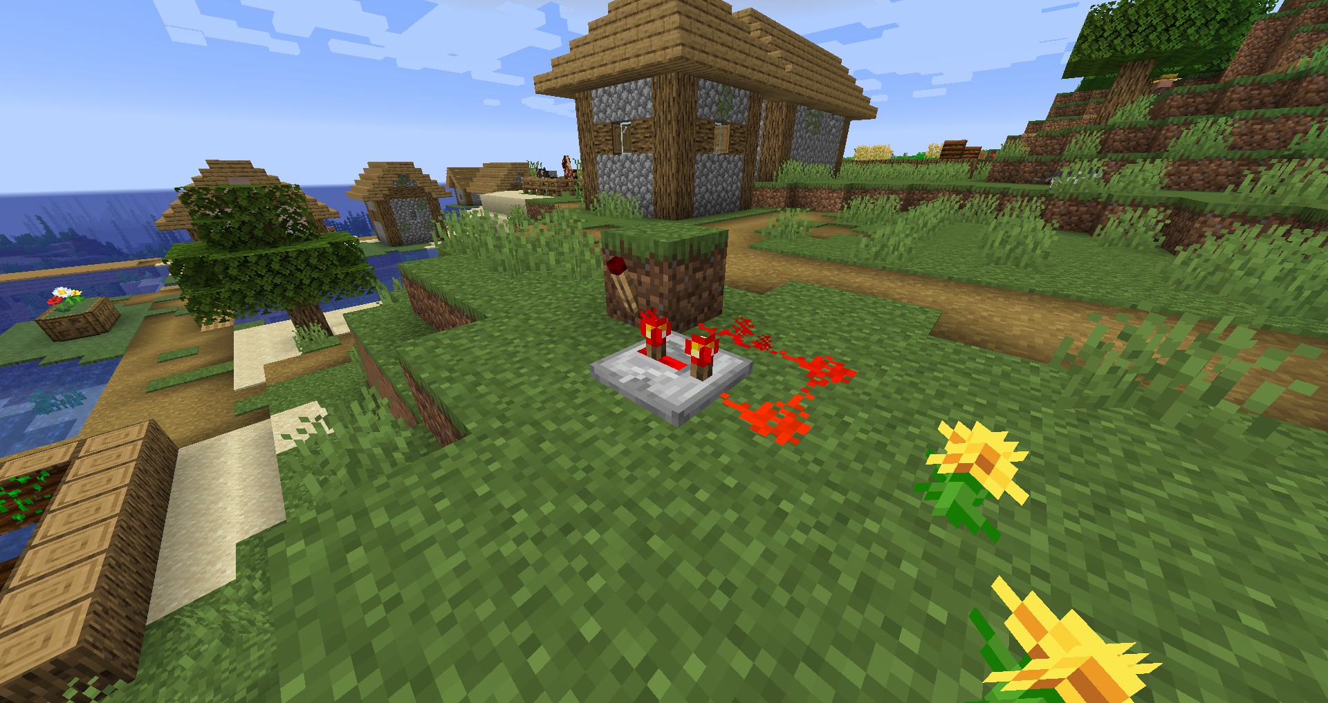 One must be careful to note that a redstone torch placed on the side of a block of dirt is actually part of the block next to the dirt, not part of the dirt block itself. Similarly, redstone wire that is placed on top of a block of dirt is part of the block above the dirt. However, if the block on which the redstone wire is placed becomes powered in any way, so does the redstone wire.