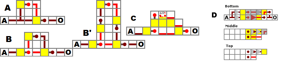 A compact yet simple 2-X-1 device can also be built if you're constricted to long hallways with little room for width. However, due to the design, this only works with pulsed inputs and not with constant-input circuits. Unlike the previous designs, however, it can deal with 1-tick pulses.