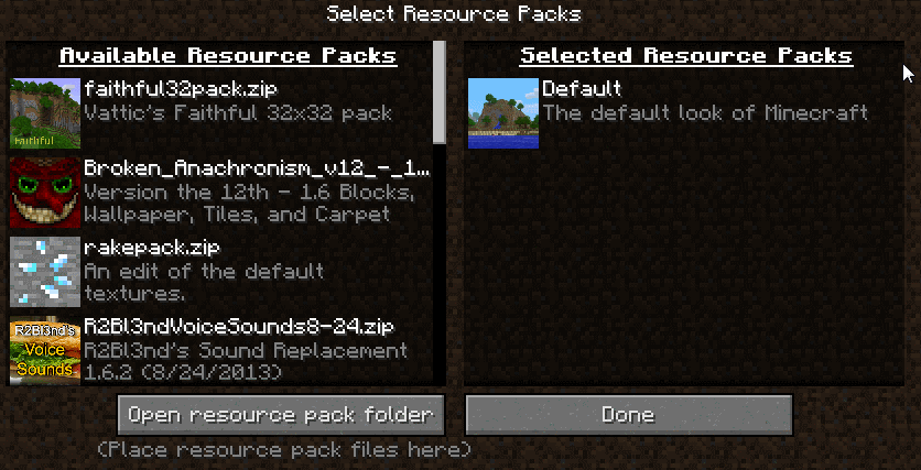 Resource packs can be placed in the folder resourcepacks within the .minecraft folder. Each resource pack is either a sub-folder or a .zip file within the resourcepacks folder. Once in the folder, a resource pack can be added from the options, where resource packs can be moved between "Available resource packs" and "Selected resource packs". "Selected resource packs" also contain the default assets on the bottom, which cannot be removed.