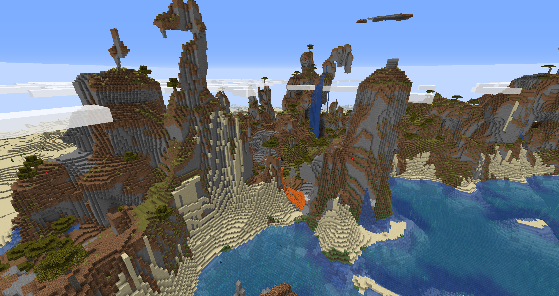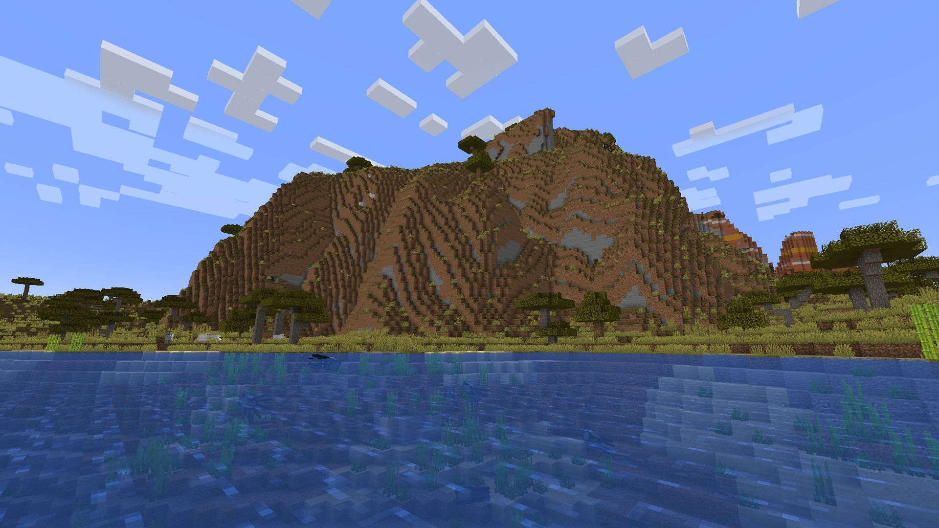 The rare windswept savanna variant generates in areas with high erosion and weirdness, which means that the terrain is arguably the most chaotic in the game, a contrast from the otherwise flat savanna. It is full of extremely steep mountains, enormous overhangs, floating islands and huge waterfalls and lavafalls, with higher and rougher terrain than the windswept hills biome, and can often go past the layer 200. Large and deep lakes often form on the bases of the mountains.