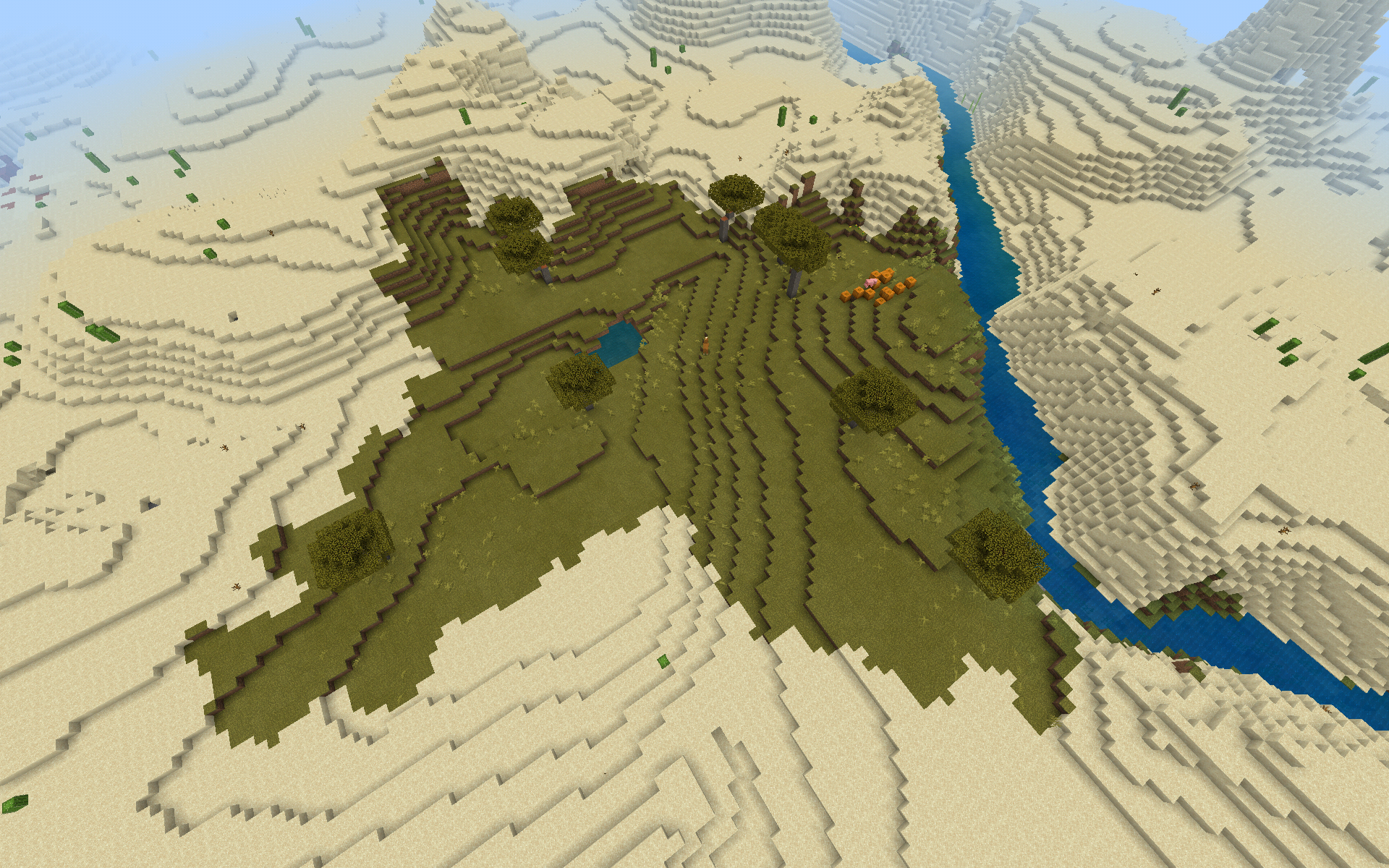 A shattered savanna biome, noted by the coarse dirt and exposed stone, that failed to properly generate due to a river.