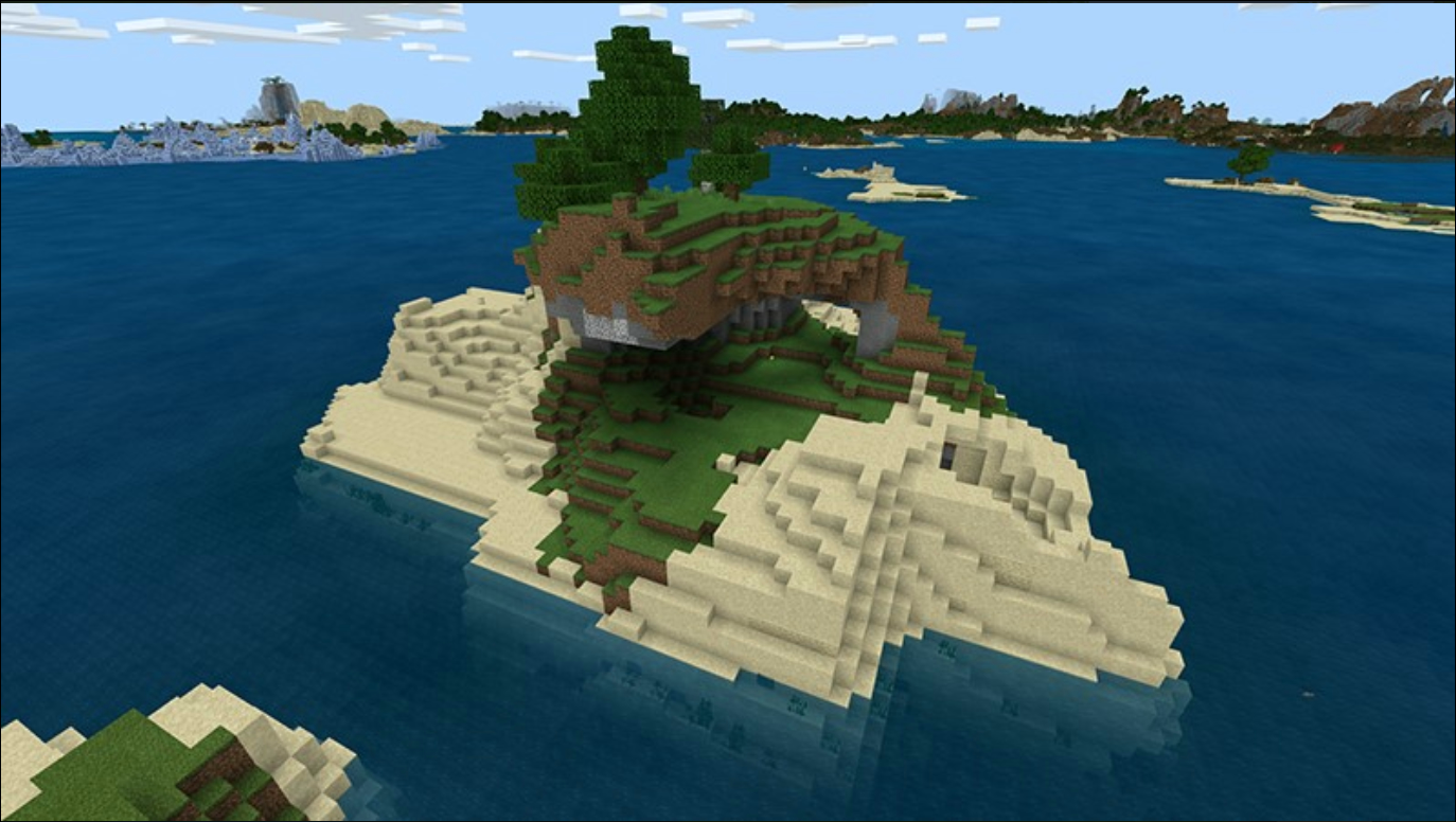Since 1.11. See also Tutorials/Island survival for tips on surviving. The player spawns in an oak tree on a small plain on top of a tall island with steep sand cliffs, populated by sheep and spiders. There are two small desert islands to the north and two more to the south. The island directly north has buried treasure, turtles, and cows. | |