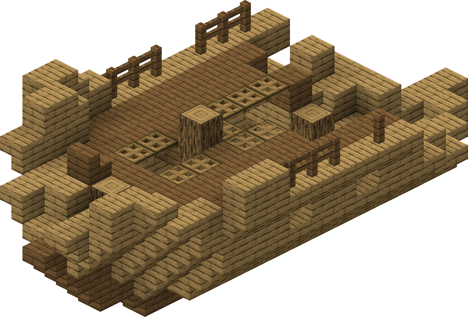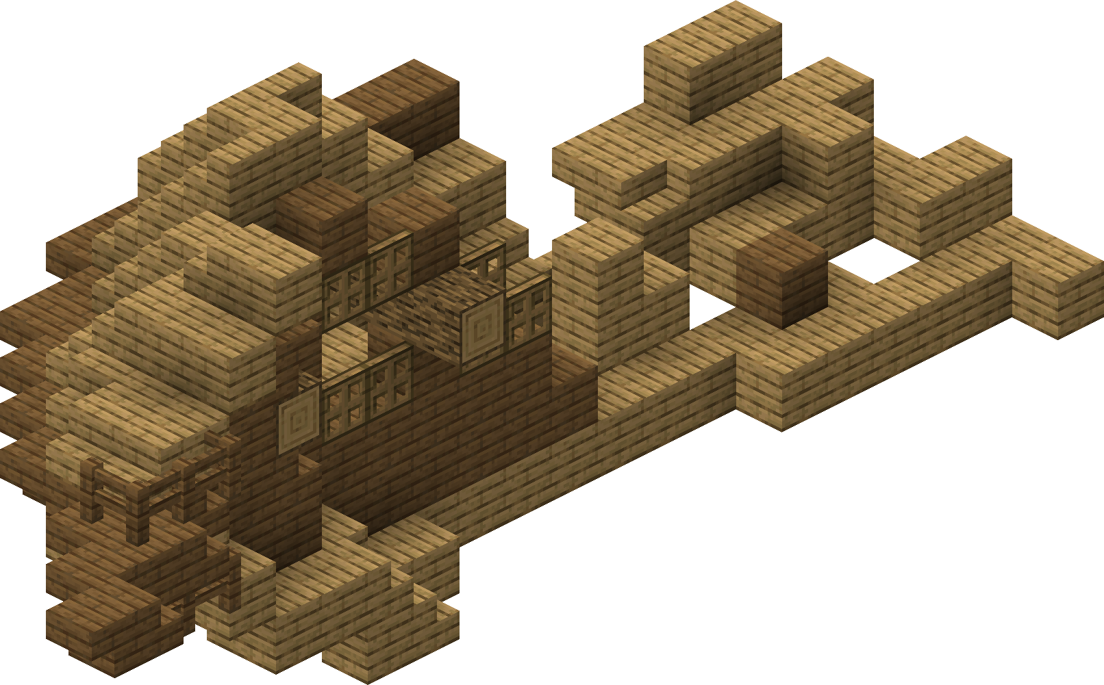 Shipwrecks generate in one of three ways: upright, keeled sideways or upside-down. In many cases, they are missing their bow (front) or stern (rear), mast or multiple other blocks, giving them a damaged appearance; however, it is also possible, but rare, to find them completely intact. They consist solely of wooden materials, including logs[JE only]/stripped logs[BE only], planks, fences, slabs, stairs, trapdoors, a door (if the ship is upright), and up to 3 chests, depending on rotation and intact sections of the ship. The bow is supposed to generate one chest (unless upside-down) while the stern should generate two, and the whole ship generates a maximum of three chests, regardless of the ship's rotation or condition. However, there are some instances in which chests that usually generate in a shipwreck section are missing. All variants of overworld wood are used in the shipwreck's structure (except acacia[JE only] and mangrove), but only two wood types are used per ship. Warped wood and crimson wood are not used in shipwrecks, as they are only found in the nether.