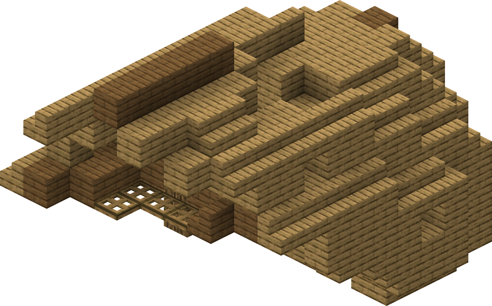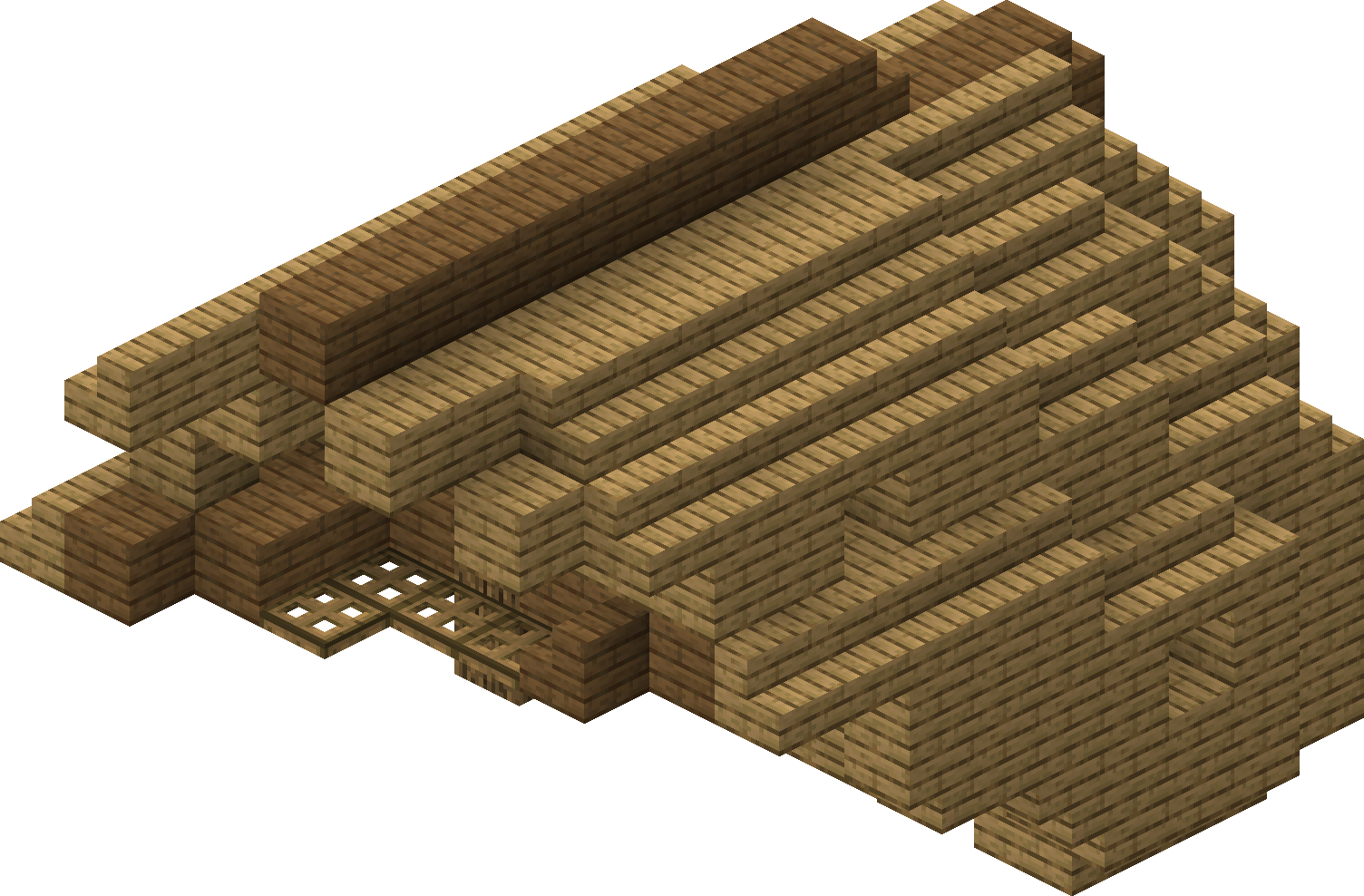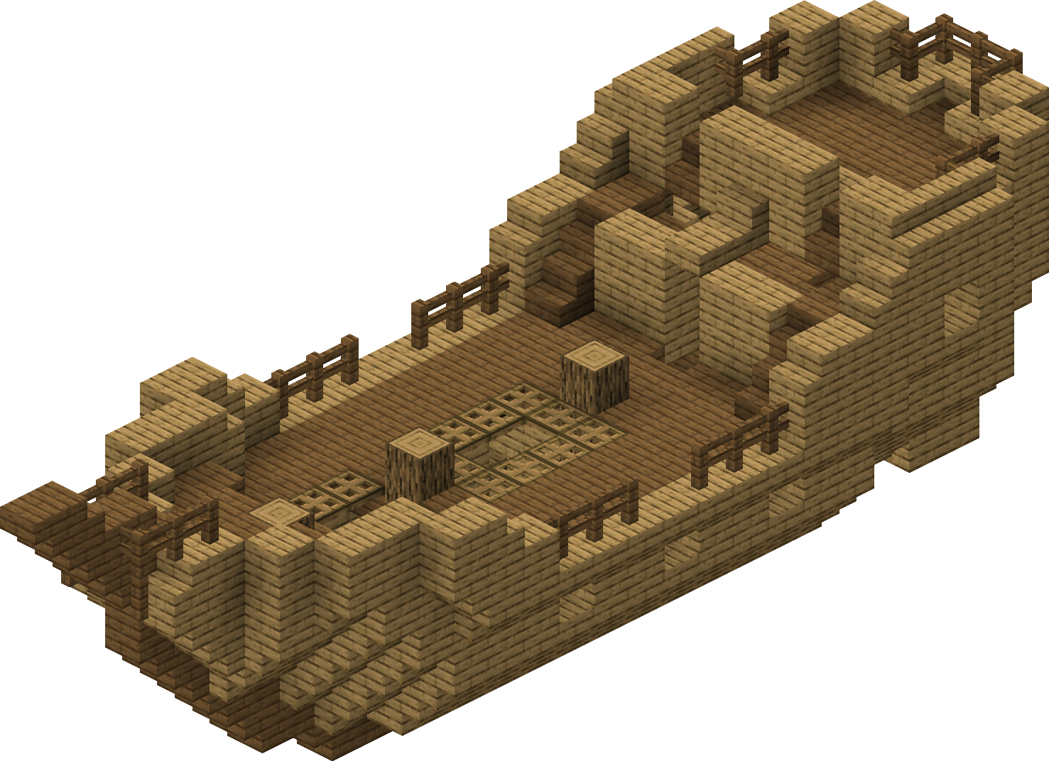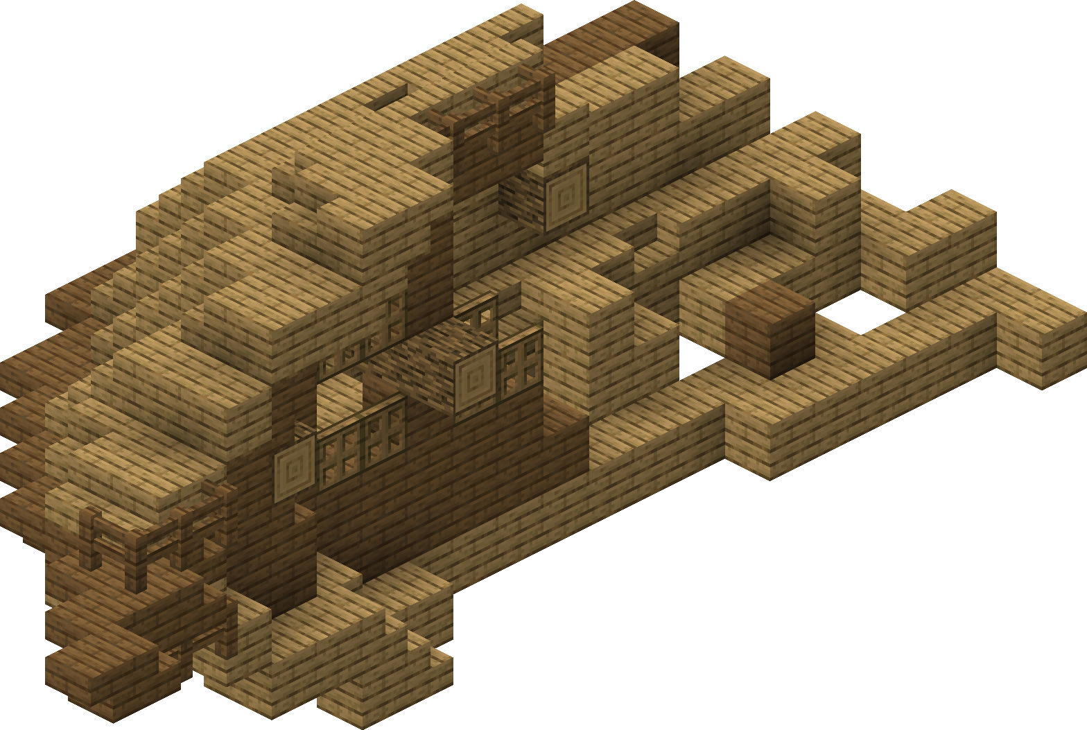 Shipwrecks generate in one of three ways: upright, keeled sideways or upside-down. In many cases, they are missing their bow (front) or stern (rear), mast or multiple other blocks, giving them a damaged appearance; however, it is also possible, but rare, to find them completely intact. They consist solely of wooden materials, including logs[JE only]/stripped logs[BE only], planks, fences, slabs, stairs, trapdoors, a door (if the ship is upright), and up to 3 chests, depending on rotation and intact sections of the ship. The bow is supposed to generate one chest (unless upside-down) while the stern should generate two, and the whole ship generates a maximum of three chests, regardless of the ship's rotation or condition. However, there are some instances in which chests that usually generate in a shipwreck section are missing. All variants of overworld wood are used in the shipwreck's structure (except acacia[JE only] and mangrove), but only two wood types are used per ship. Warped wood and crimson wood are not used in shipwrecks, as they are only found in the nether.