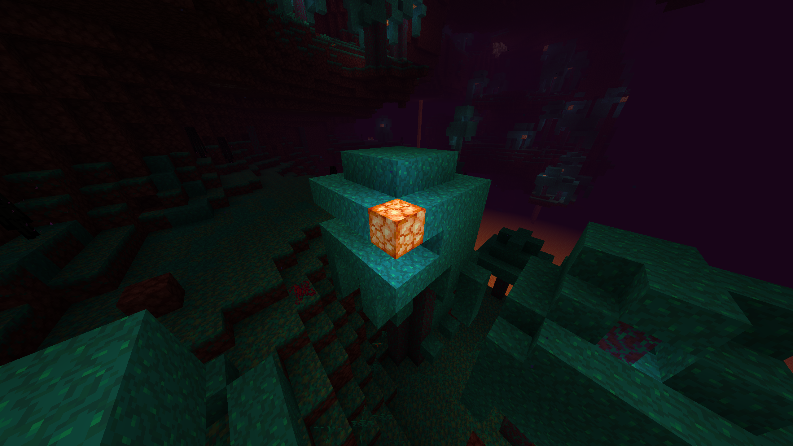 A huge warped fungi with a block of naturally generated shroomlight visible.