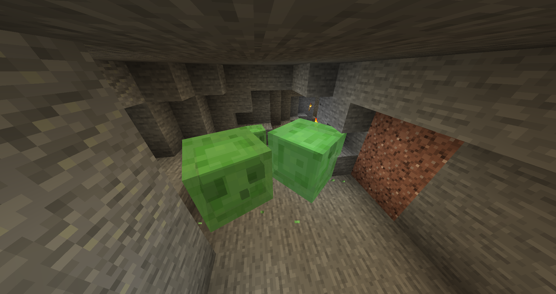 Slimes are bouncy, cube-shaped hostile mobs that spawn deep underground in particular chunks, or in swamp biomes. They attack by jumping at their targets, come in three sizes and larger slimes can split into smaller ones on death.