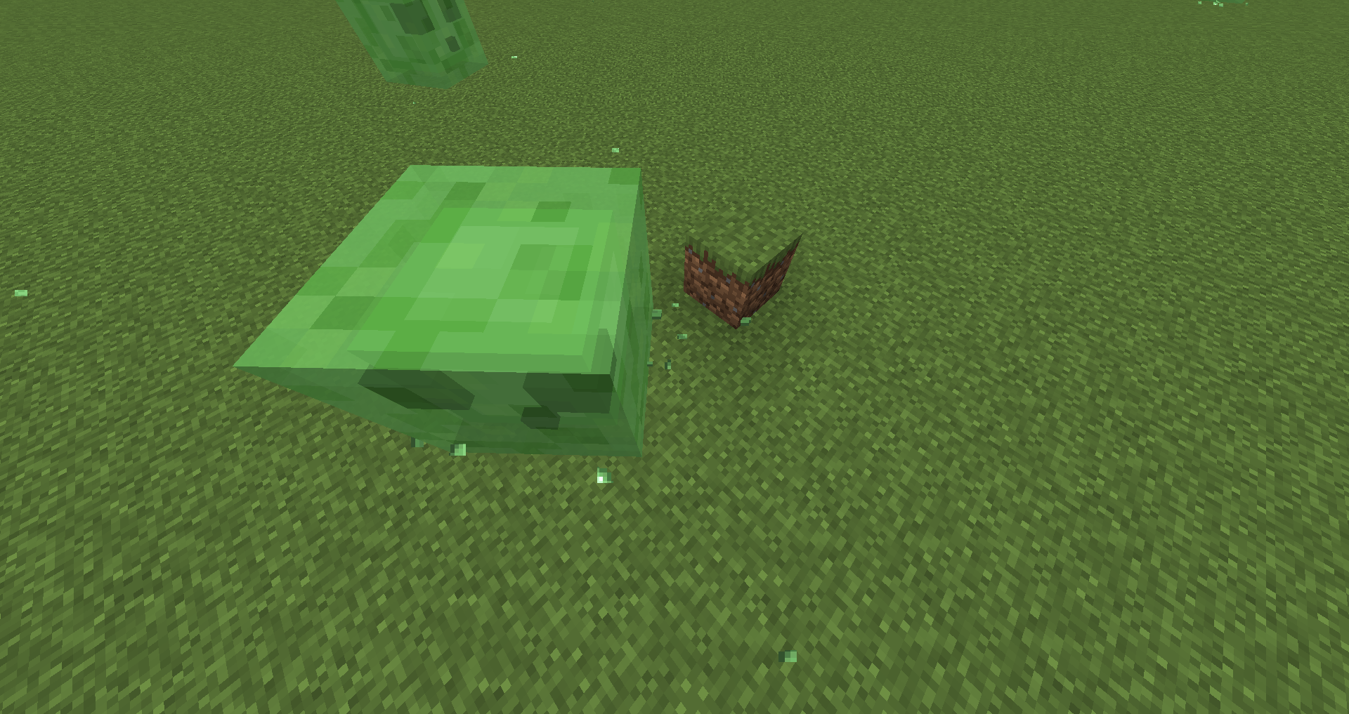 - When a slime searches for nearby targets or checks to see if it should despawn, it checks from a point at the center of its hitbox on the x and z-axis and the bottom of its y-axis. Therefore, a custom-size slime sufficiently huge can be right in front of the player and be completely passive, and it may even despawn if the slime is large enough.