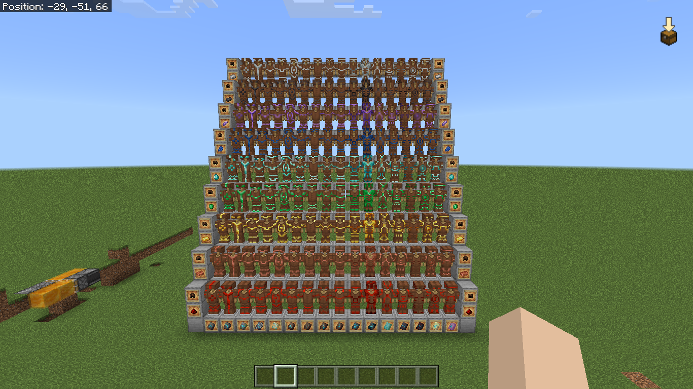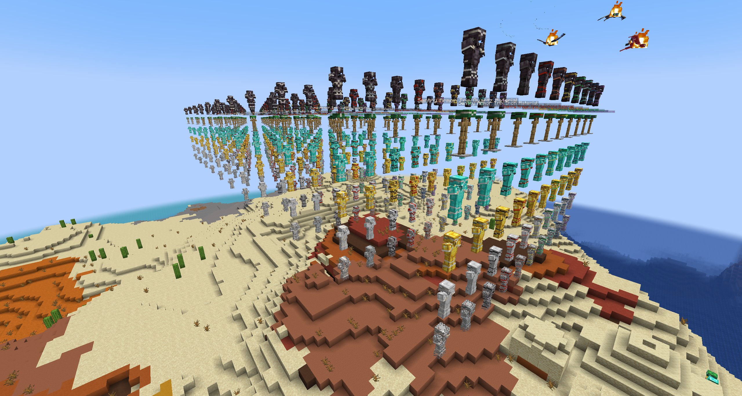 A display of all eleven (before Java Edition 23w12a) armor trims and ten colors on netherite armors.