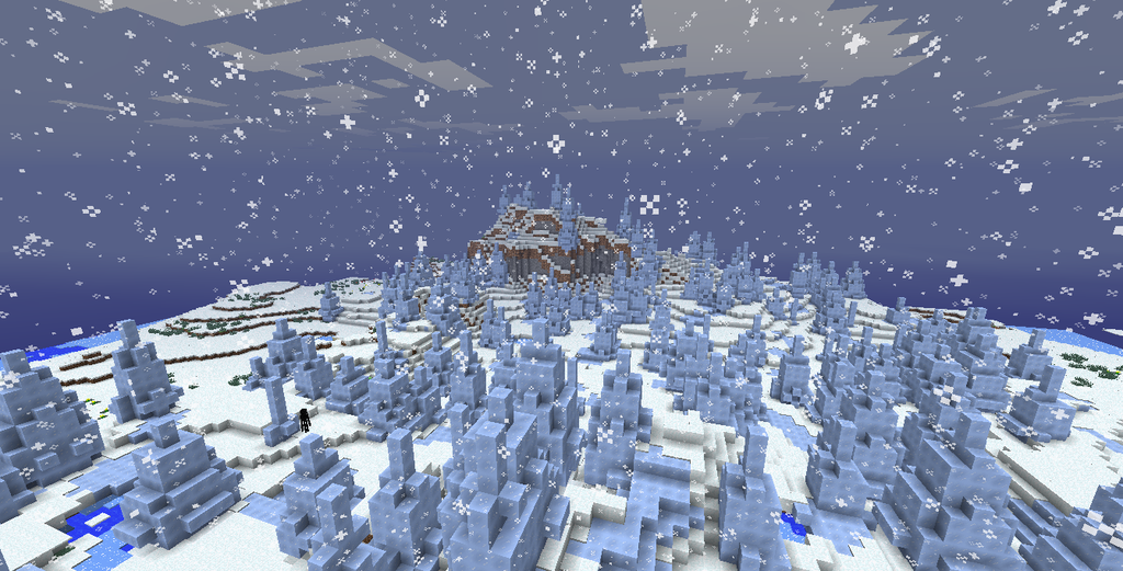 This rarer variety ice spikes biome features large numbers of ice spikes and ice patches dotting across its landscape. Additionally, all grass blocks are replaced with snow blocks so that no trees nor other vegetations can generate. Snow layers still form atop the snow blocks, making them seem taller than they actually are. No buildings may generate in this biome.