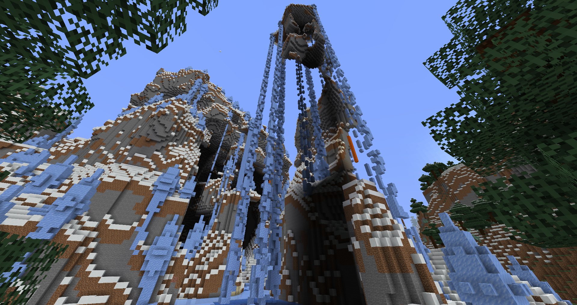 This rare variant features large numbers of packed ice spikes across its landscape. Additionally, all grass blocks are replaced with snow blocks, and glaciers of packed ice generate as well instead of lakes. The spikes come in two sizes: a short, wide spike, and a tall, thin spike. The short spikes generate more often than the tall spikes. Short spikes are about 15 blocks tall, while tall spikes can be over 50 blocks tall. Prior to the Update Aquatic, this biome was the only source of packed ice in the game. No buildings may generate in this biome, though polar bears, rabbits and strays still spawn.