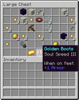 A screenshot of a loot chest in a Bastion Ruin that containing boots with Soul Speed enchantment. The only other way to get the Soul Speed is by bartering with Piglins This file (or parts -