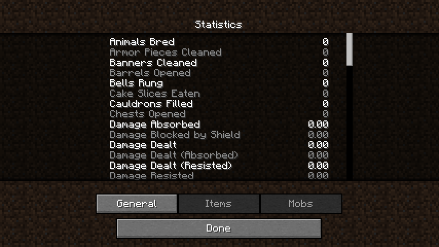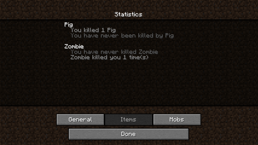 - Mobs – The Mob screen shows for each different type of mobs how many the player has killed, or the number of deaths caused by those mobs.