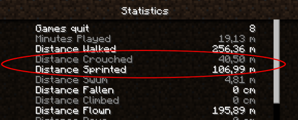 | Distance Crouched | The total distance walked while sneaking. | minecraft:crouch_one_cm |