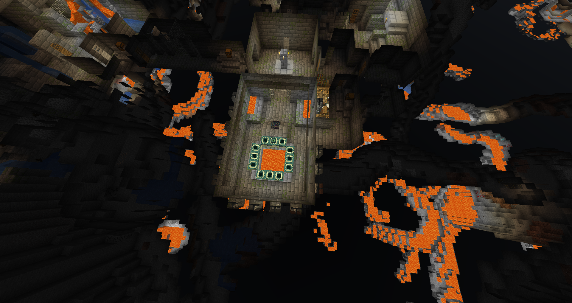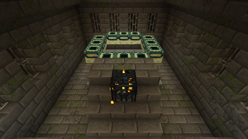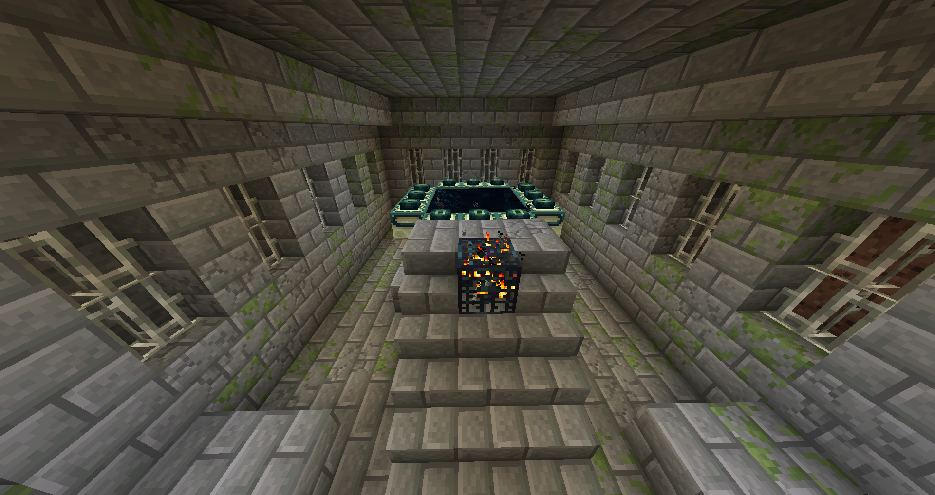 - End portal room: Contains an end portal and a silverfish spawner. There are two pools of 3 lava sources in the front sides of the room and a bigger lava pool of 9 below the end portal, and 16 windows of 2 iron bars in the room, with the entrance, always being a gate. In most cases, this room cannot be overwritten by other structures generated around it. Only one per stronghold, and it is never within 5 rooms of the starting staircase. Each portal frame has a 10% chance to generate containing an eye; the average number of portal frames found prefilled is 1.2. The chance of the portal being completely pre-filled is one in a trillion (1:1,000,000,000,000 or 10-12).