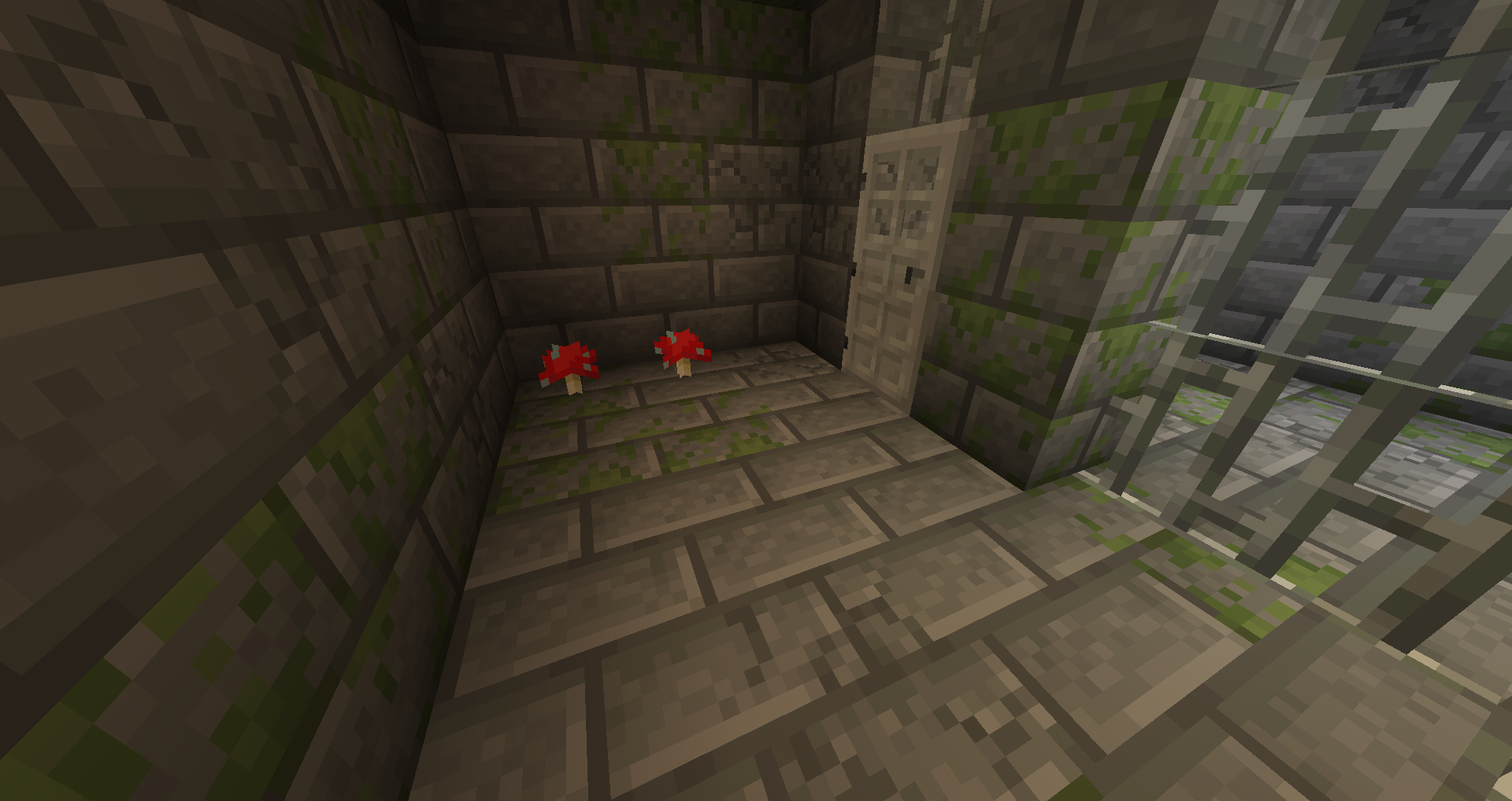 - Empty prison cells: A corridor with one wall partially made of iron bars and with two iron doors (in an "open" position, with no buttons). Beyond each iron door are cells with an iron bar wall between them. An exit is opposite the entrance. 0–5 rooms per stronghold. In Bedrock Edition, no iron doors are generated.
