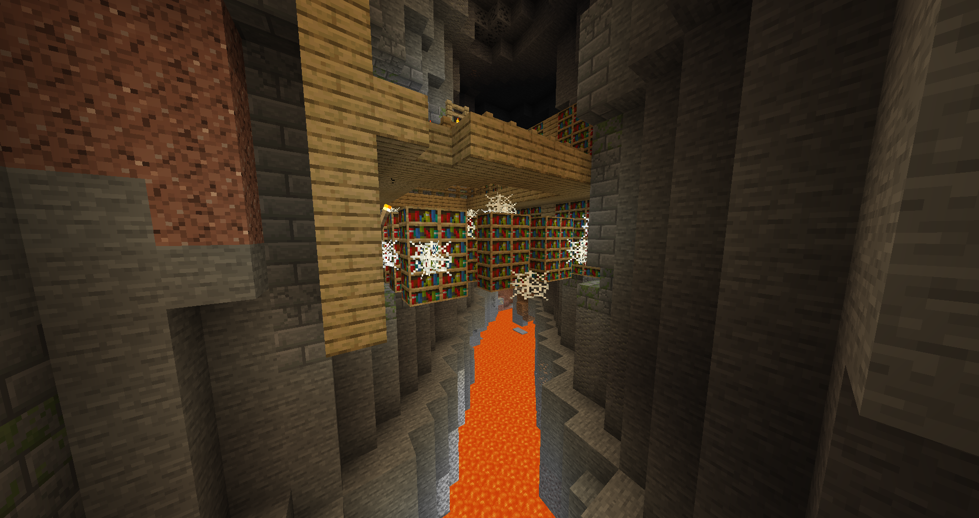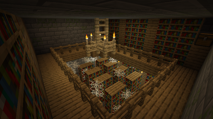 Large libraries contain a second level consisting of a surrounding balcony with oak fences as railings, and fences & torches arranged like a chandelier over the center of the room. The two levels are connected by a ladder on the wall furthest from the entrance. No cobwebs generate here.