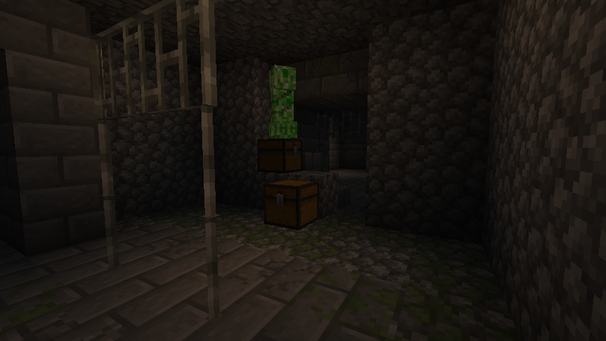 - Store rooms: Dual-level rooms, each 2 blocks high, with a cobblestone center structure joining the two. A lone torch is housed within the structure. A ladder runs up the side wall for access to the second floor, which is a chamber made of wood planks and containing a chest.