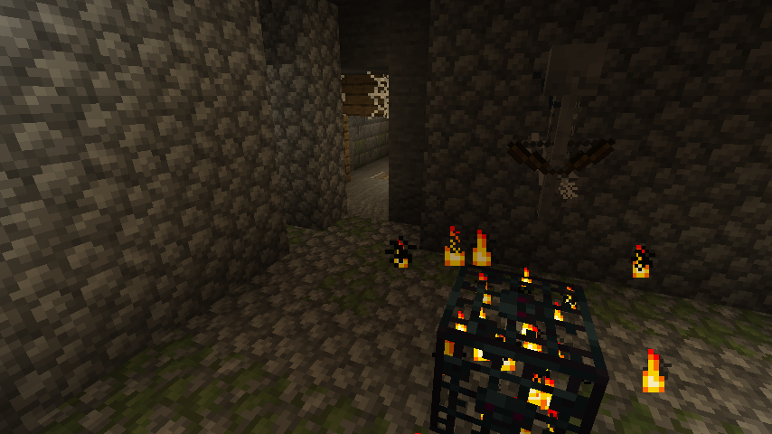 - Five-way crossing: Has up to five exits (six counting the entrance): one across from the entrance down a short stairway made of stone slabs and stone brick blocks, one each to the left and right of the entrance, one on the left side of the upper level reached by a short stairway made of stone slabs and stone brick blocks, and one on the right side of the upper level across a bridge of stone slabs and double stone slabs over the downward stair. A single torch is on the side of the bridge.