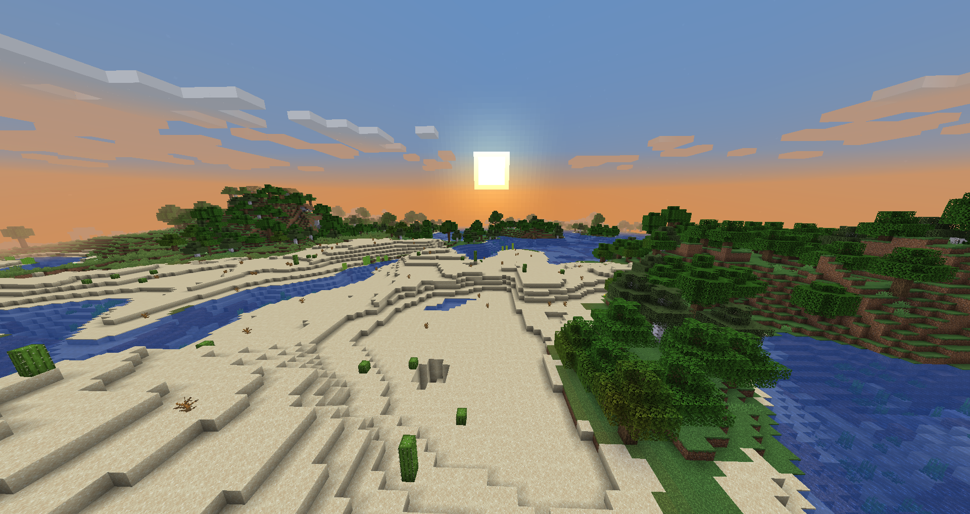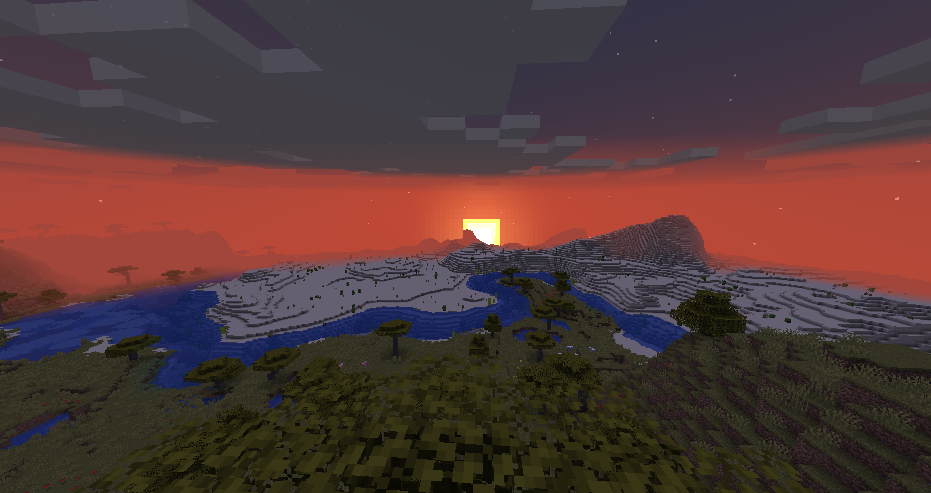 River running between Forest and Windswept Hills biome with sunset in the background.