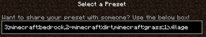 Note that the preset code currently cannot fully describe a superflat level generation preset. Settings related to features and structures are inaccessible in the preset code. Using the preset code and the "Remove Layer" function to recreate world can only ensure that the blocks on each layer are the same, but cannot guarantee the same settings of features or structures. When using preset code, the settings for features and structures are based on what preset is selected. If no preset is selected, only villages and strongholds are generated. For example, if typing preset code with the Classic Flat preset selected, only villages will be generated. If typing it with the Overworld preset selected, features in Plains biome (except monster rooms) and Pillager Outpost, Village, Stronghold, Mineshaft, Dungeon, and Ruined Portal are generated.