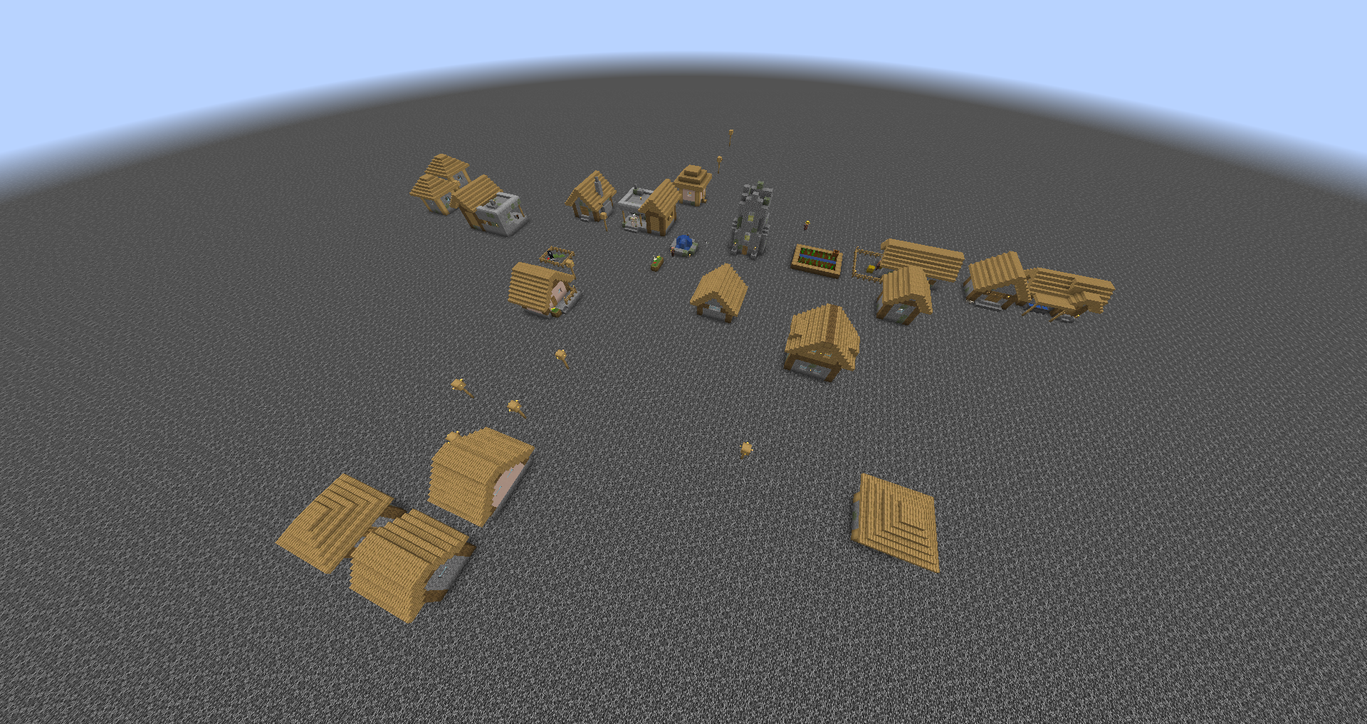 A grassland village naturally generated in a 1-block-deep bedrock superflat world.