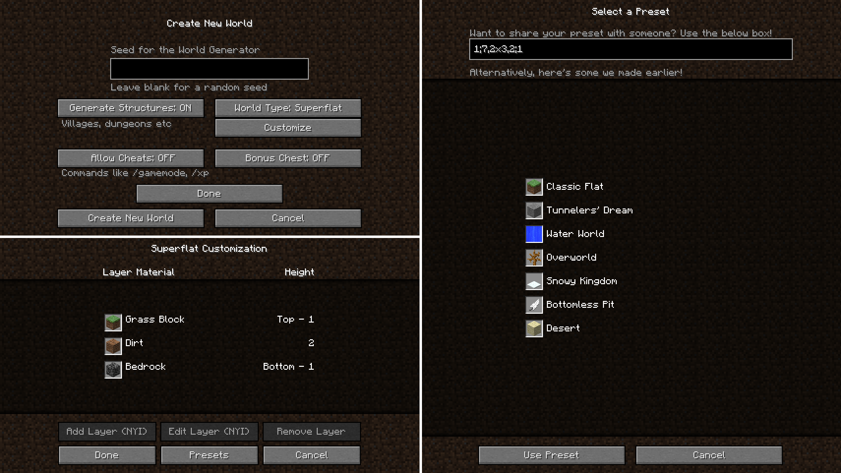 Upon selecting "Superflat" in the World Type box, a new button appears underneath labeled "Customize". The customize menu starts out with the "Classic Flat" preset of one layer of grass, two dirt layers, and then bedrock underneath. There are two buttons available to customize Superflat worlds, which include the "Remove Layer" button, used for removing unwanted types of layers, and the "Presets" button, used for selecting any of eight currently available presets.