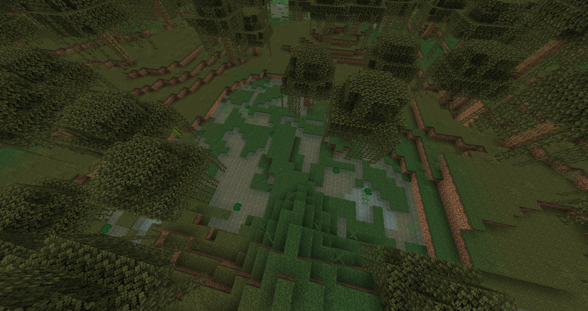 An example of the temperature variation in swamps, leading to different shades of green for the grass blocks.