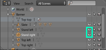 - To remove the stand, in Outliner editor, toggle off visibility of Stand left and Stand right, which are children of Banner mesh. (The light blue bordered part)