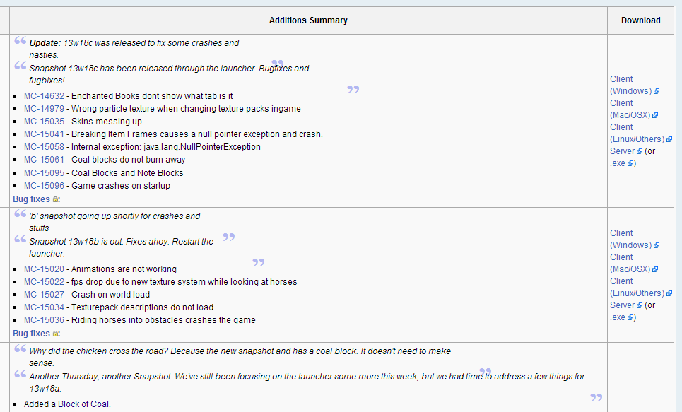 13w18a and 13w18b need to have the downloads area put together. I tryed and failed miserably. ----007a83 (Talk|Contribs) 05:10, 3 May 2013 (UTC)