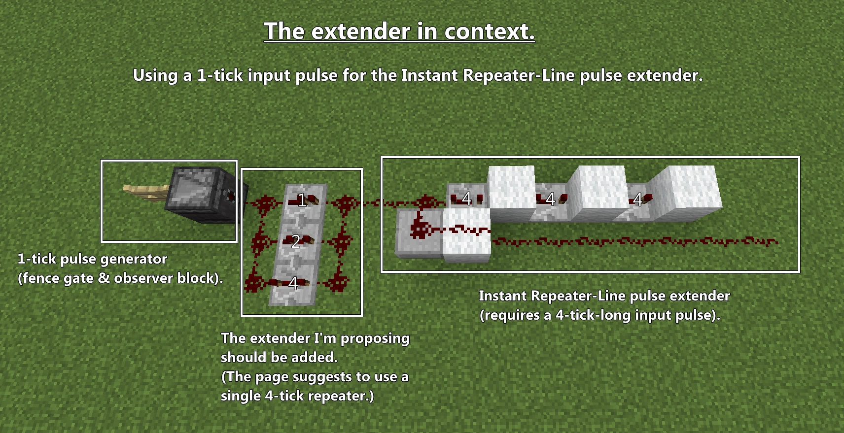 This is not a new or uncommon circuit, but it's useful when delaying a 1-tick pulse to a 4-tick pulse without adding undue delay to the circuit. The page suggests to use a repeater with 4 ticks of delay (which does work) but it also delays the pulse by 4 ticks, which might be undesirable. The simple solution is to use three parallel repeaters, set to 1, 2, and 4 ticks.