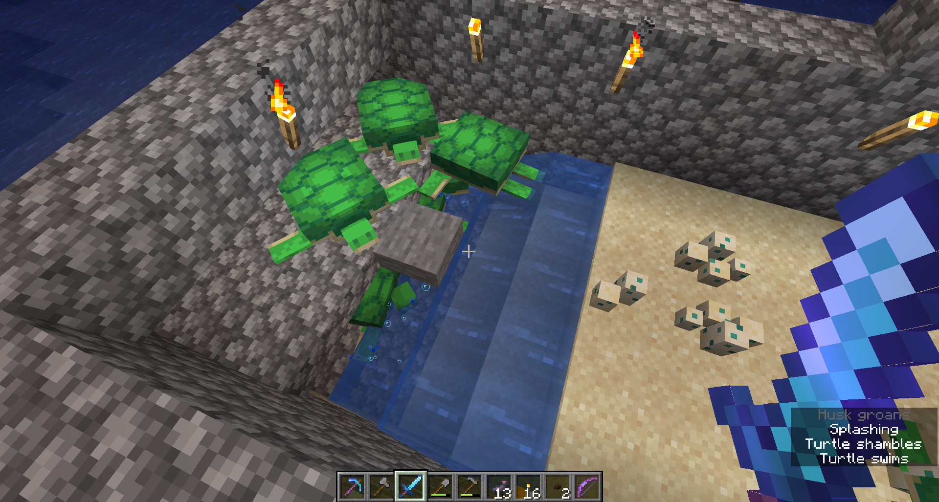- Remember, turtle eggs do require sand. So some sort of beach is needed, even if it isn't an actual beach biome. It would be interesting to see if one can breed turtles in a swamp if you add enough sand on the edge of it. Amatulic (talk) 23:37, 23 July 2021 (UTC)