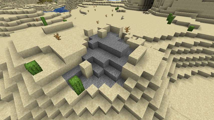 Occasionally, instead of being converted to dirt or sand, the top layer is stripped away, leaving an 'erosion' (aka. 'basin') of bare stone. They occur more often in forests or plains and occasionally contain water. Commonly, minerals can be found in these, generally coal ore and iron ore. If generated in a Badlands biome, gold ore can also be seen.