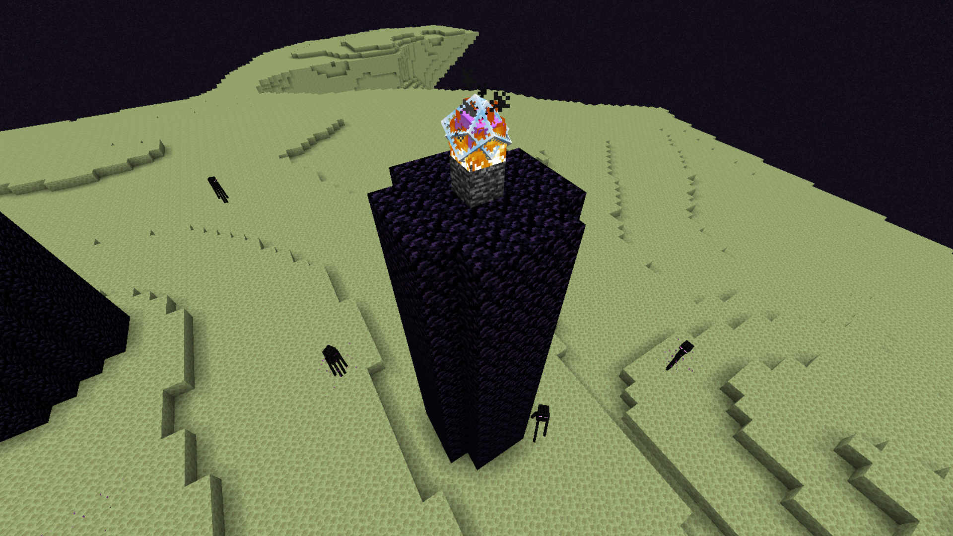 A view of the End's central island. The ender dragon can be seen flying around the end spikes.