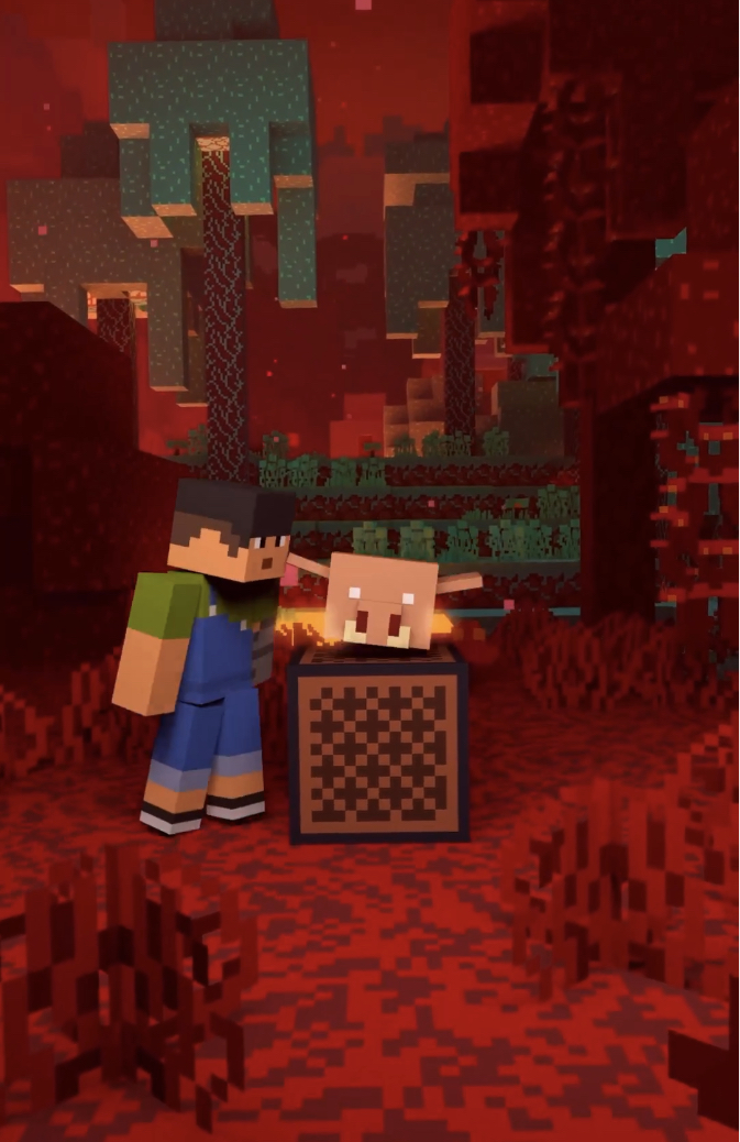 Sunny using a piglin mob head on a note block in a crimson forest.